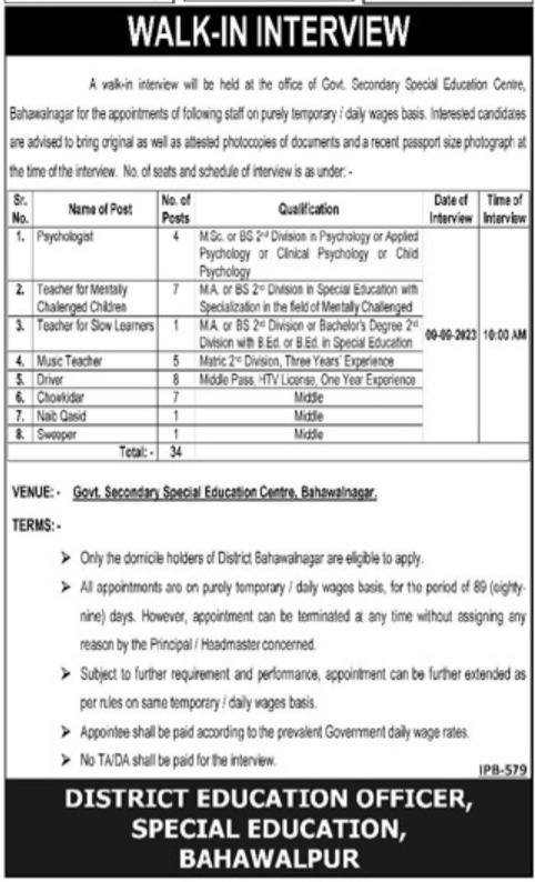 District Education Officer jobs advertisement dated about 30 August 2023 in daily Khabrain Newspaper invites application for the vacant post of psychologist, chowkidar, music teacher, teacher for mentally challenged children, driver, sweeper, teacher for slow learner and naib qasid in Bahawalnagar, bahawalnagar Punjab Pakistan. Candidates with M.sc, Matric, MA and Middle etc. educational background will be preferred.