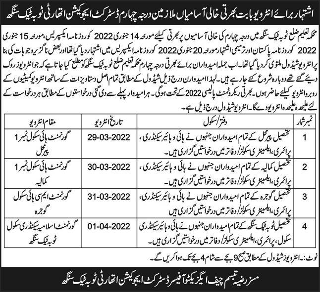 Vacant posts including security guard, chowkidar, sweeper, balawi, naib qasid, laboratory attendant and mali are announced in District Education Authority Toba Tek Singh, toba tek singh Punjab Pakistan as per 18 March 2022 advertisement in daily Express Newspaper. Candidates with Primary, Middle and Matric etc. educational background will be preferred.