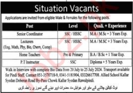 ALLIED SCHOOL jobs advertisement dated about 14 July 2024 in daily Jang Newspaper invites application for the vacant post of lecturer english, home teacher, pt instructor, lecturer computer, lecturer physics, lecturer, lecturer biology, lecturer chemistry, coordinator and lecturer maths in Rawalpindi, rawalpindi Punjab Pakistan. Preferred Education is M.sc, MA and BA etc.