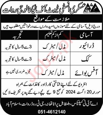 Askari Institute of Technology jobs advertisement dated about 11 August 2024 in daily Express Newspaper invites application for the vacant post of office boy, cook and driver in Islamabad, islamabad Islamabad Pakistan. Persons with Matric and Middle etc. education can apply.