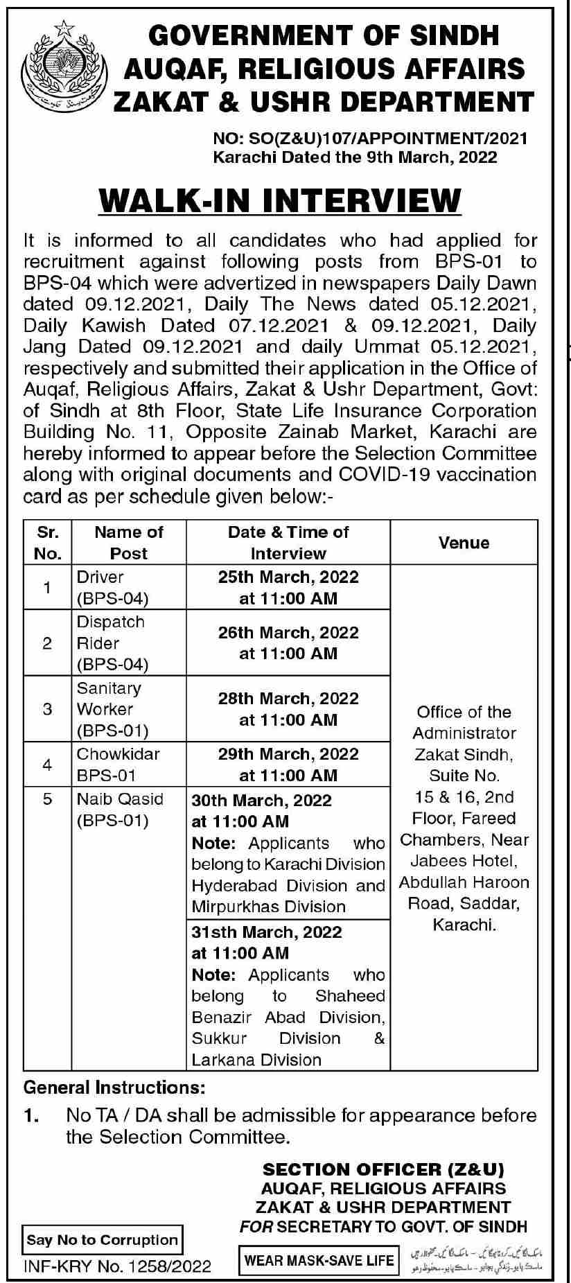 Auqaf Religious Affairs and Zakat & Ushr Department jobs advertisement dated about 11 March 2022 in daily Dawn Newspaper invites application for the vacant post of sanitary worker, dispatch rider, naib qasid, chowkidar and driver in Karachi, karachi Sindh Pakistan. Matric, Middle and Primary etc. educational qualification will be preferred.