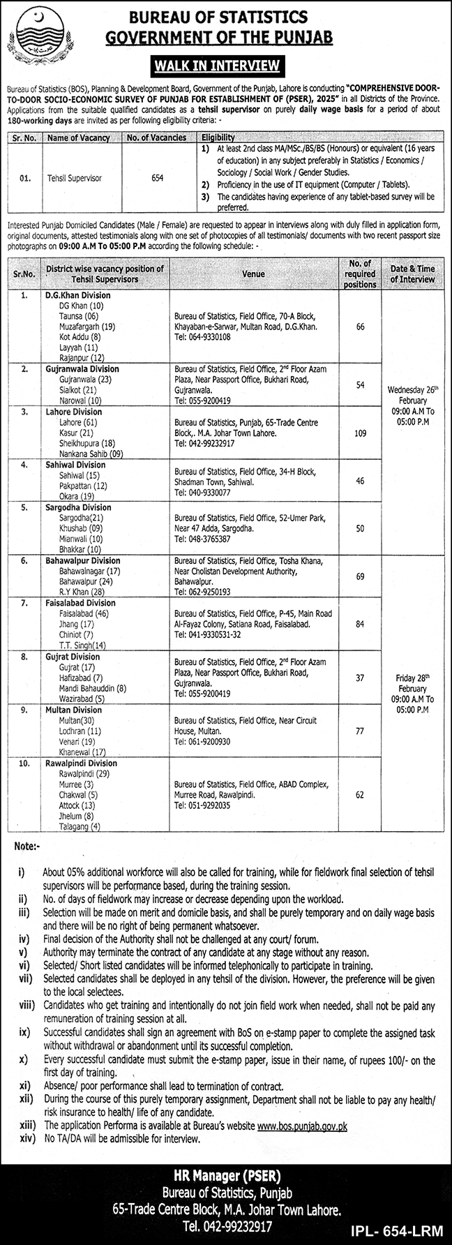 Bureau of Statistics latest Government Management walk in interview jobs and others can be applied till 26 February 2025 or as per closing date in newspaper ad. Read complete ad online to know how to apply on latest Bureau of Statistics job opportunities.