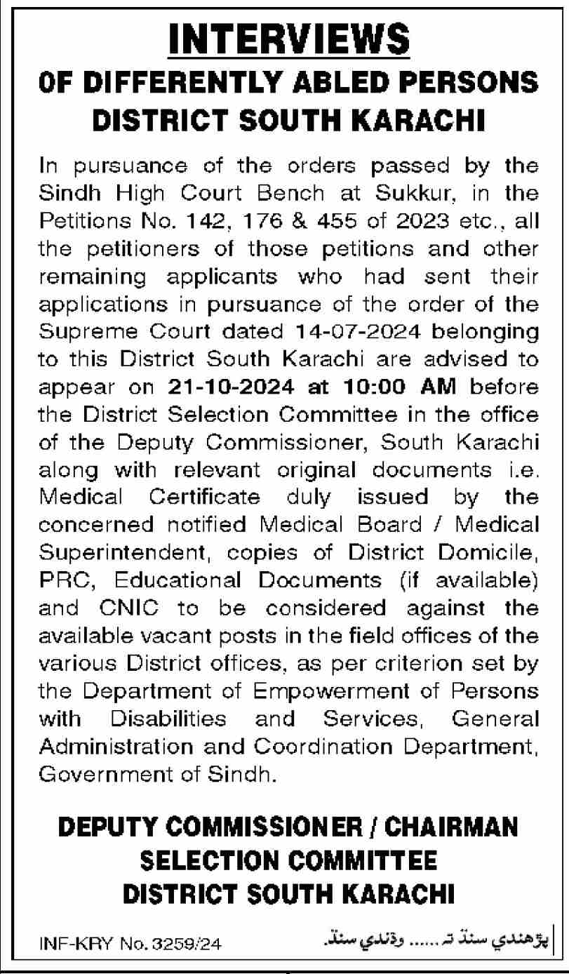 Department of Empowerment of Persons with Disabilities jobs advertisement dated about 15 October 2024 in daily Dawn Newspaper invites application for the vacant post of male female staff and management staff in Karachi, karachi Sindh Pakistan. Bachelor, Master and Intermediate etc. educational qualification will be preferred.