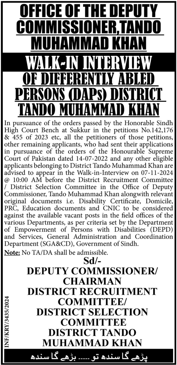 Deputy Commissioner Office invites applications for job positions advertised in daily Express Tribune dated 29 October 2024 for following vacancies in Tando Muhammad Khan, tando muhammad khan Sindh Pakistan.