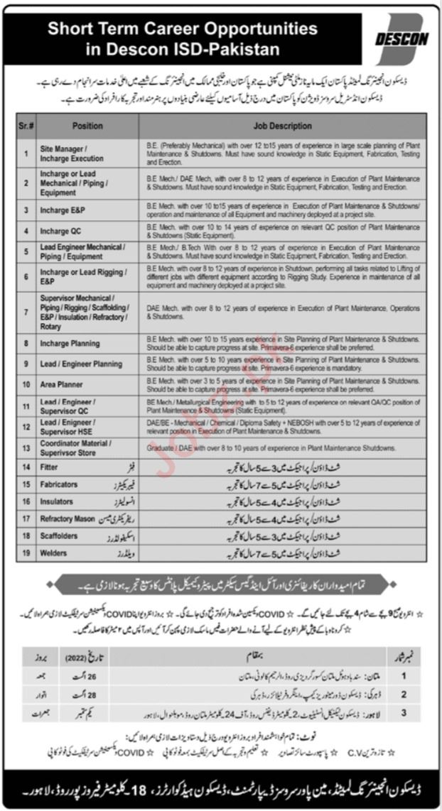 Vacant posts including refractory mason, insulator, incharge lead mechanical piping equipment, welder, incharge ep, supervisor mechanical, site manager, coordinator material, fitter, scaffolder, area planner, incharge planning, fabricator, supervisor store, lead engineer mechanical, lead rigging, incharge qc, engineer planning, supervisor qc and supervisor hse are announced in Descon Engineering Limited Lahore, lahore Punjab Pakistan as per 21 August 2022 advertisement in daily Jang Newspaper. Persons with DAE, Bachelor and B.E etc. education can apply.