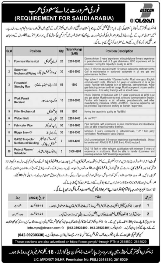 Descon Engineering Limited Riyadh, riyadh Saudi Arabia invites applications from eligible candidates for the post of standby man, rigger, qa inspector, qc inspector, fitter mechanical, supervisor piping, welder multi, foreman mechanical, project planner, firewatch, project scheduler, fabricator pipe, supervisor mechanical and work permit receiver as per advertisement of August 13, 2024 published in daily Jang Newspaper. Educational qualifications required Others, Matric, Intermediate, Bachelor and DAE etc.