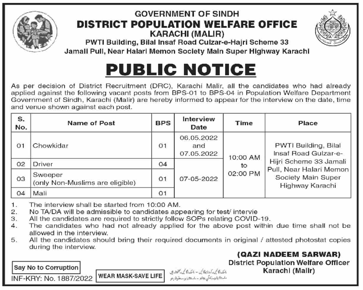 Vacant posts including sweeper, mali, chowkidar and driver are announced in District Population Welfare Office Karachi, karachi Sindh Pakistan as per 15 April 2022 advertisement in daily Dawn Newspaper. Educational qualifications required Middle and Primary etc.