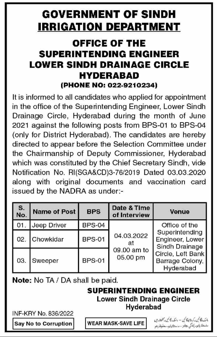 Irrigation Department invites applications for job positions advertised in daily Dawn dated 24 February 2022 for following vacancies in Hyderabad, hyderabad Sindh Pakistan.