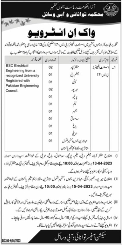 Electricity Department jobs advertisement dated about 4 April 2023 in daily Nawaiwaqt Newspaper invites application for the vacant post of assistant engineer in Muzaffarabad, muzaffarabad, kotli, jhelum valley, poonch, bhimber, mirpur, haveli, neelum valley and bagh AJK Pakistan. Candidates with B.E etc. educational background will be preferred.