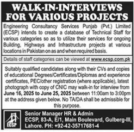 Engineering Consultancy Services Punjab ECSP invites applications for job positions advertised in daily The News dated 14 June 2025 for following vacancies in Gulberg 3 Lahore, lahore Punjab Pakistan.