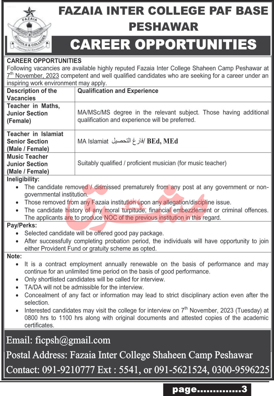 Fazaia Inter College invites applications for job positions advertised in daily Mashriq dated 3 November 2023 for following vacancies in Peshawar, peshawar Khyber Pakhtunkhwa KPK Pakistan.