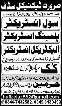 Harmain Trade Test & Technical Training Center is looking for candidates for following posts as per job advertisement published in daily Express Newspaper of September 27, 2024 for location Lahore, lahore Punjab Pakistan: