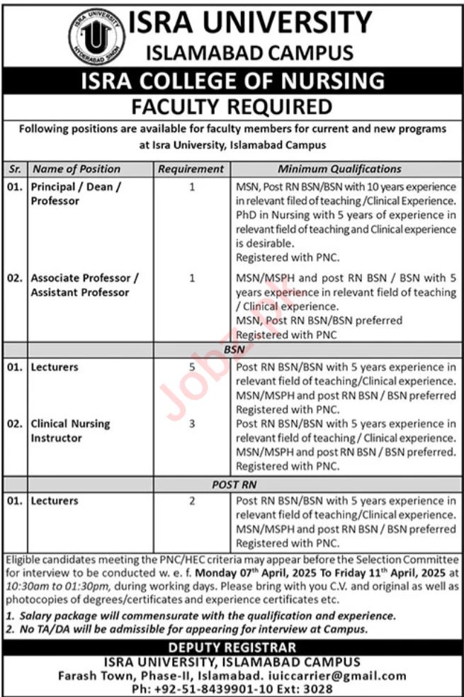 ISRA University jobs advertisement dated about 23 March 2025 in daily The News Newspaper invites application for the vacant post of principal, clinical nursing instructor, dean, assistant professor, associate professor, professor and lecturer in Frash Town Islamabad, islamabad Islamabad Pakistan. Candidates with Bachelor and Master etc. educational background will be preferred.