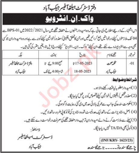 Office of District Health Officer Jacobabad, jacobabad Sindh Pakistan invites applications from eligible candidates for the post of bps i to bps iv as per advertisement of April 30, 2023 published in daily Jang Newspaper. Persons with Middle, Primary and Matric etc. education can apply.