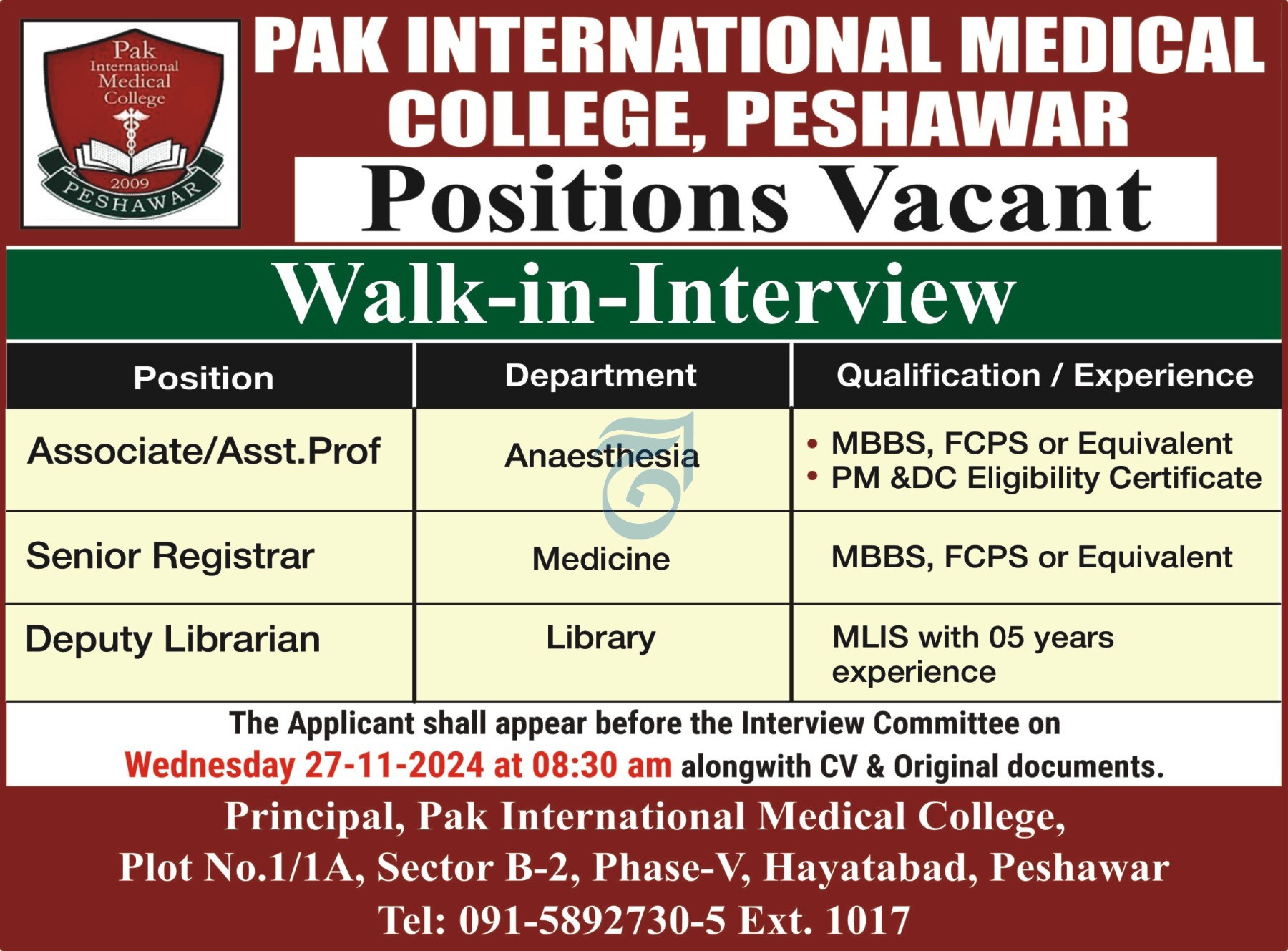 Vacant posts including assistant professor, associate professor, deputy librarian and registrar are announced in Pak International Medical College Peshawar, peshawar Khyber Pakhtunkhwa KPK Pakistan as per 23 November 2024 advertisement in daily Aaj Newspaper. Candidates with Master and MBBS etc. educational background will be preferred.