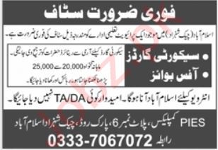 PIES Complex Islamabad Islamabad, islamabad Islamabad Pakistan invites applications from eligible candidates for the post of security guard and office boy as per advertisement of July 28, 2024 published in daily Jang Newspaper. Middle and Matric etc. educational qualification will be preferred.