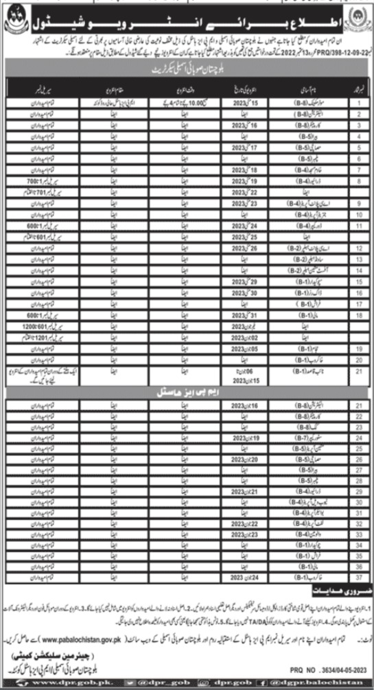 Vacant posts including khadim masjid, plumber, motor mechanic, sound helper, daak runner, cook, ac plant operator, masalchi, naib qasid, mali, hujjam, carpenter, generator operator, store keeper, boiler operator, tube well operator, khakrob, electrician, chowkidar, offset machine helper, ac plant helper, bearer, lift operator, driver, farash, machine operator, valve man and door keeper are announced in Provincial Assembly Secretariat Quetta, quetta Balochistan Pakistan as per 5 May 2023 advertisement in daily Jang Newspaper. Primary, Others, Intermediate, Middle and Matric etc. educational qualification will be preferred.