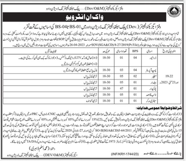 Vacant posts including pump operator, chowkidar, helper, driver, beldar, naib qasid and sanitary worker are announced in Public Health Engineering Division Dadu, dadu Sindh Pakistan as per 8 May 2023 advertisement in daily Jang Newspaper. Primary and Middle etc. educational qualification will be preferred.