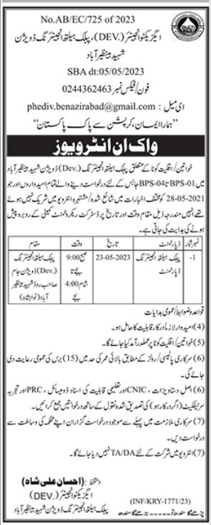Public Health Engineering Division Nawabshah, nawabshah Sindh Pakistan invites applications from eligible candidates for the post of bps one to bps four as per advertisement of May 8, 2023 published in daily Jang Newspaper. Educational qualifications required Middle and Primary etc.