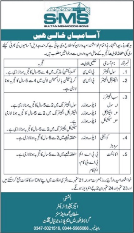 Sultan Mehmood & Sons invites applications for job positions advertised in daily Mahasib dated 22 September 2023 for following vacancies in Gilgit, gilgit Gilgit Baltistan Pakistan.