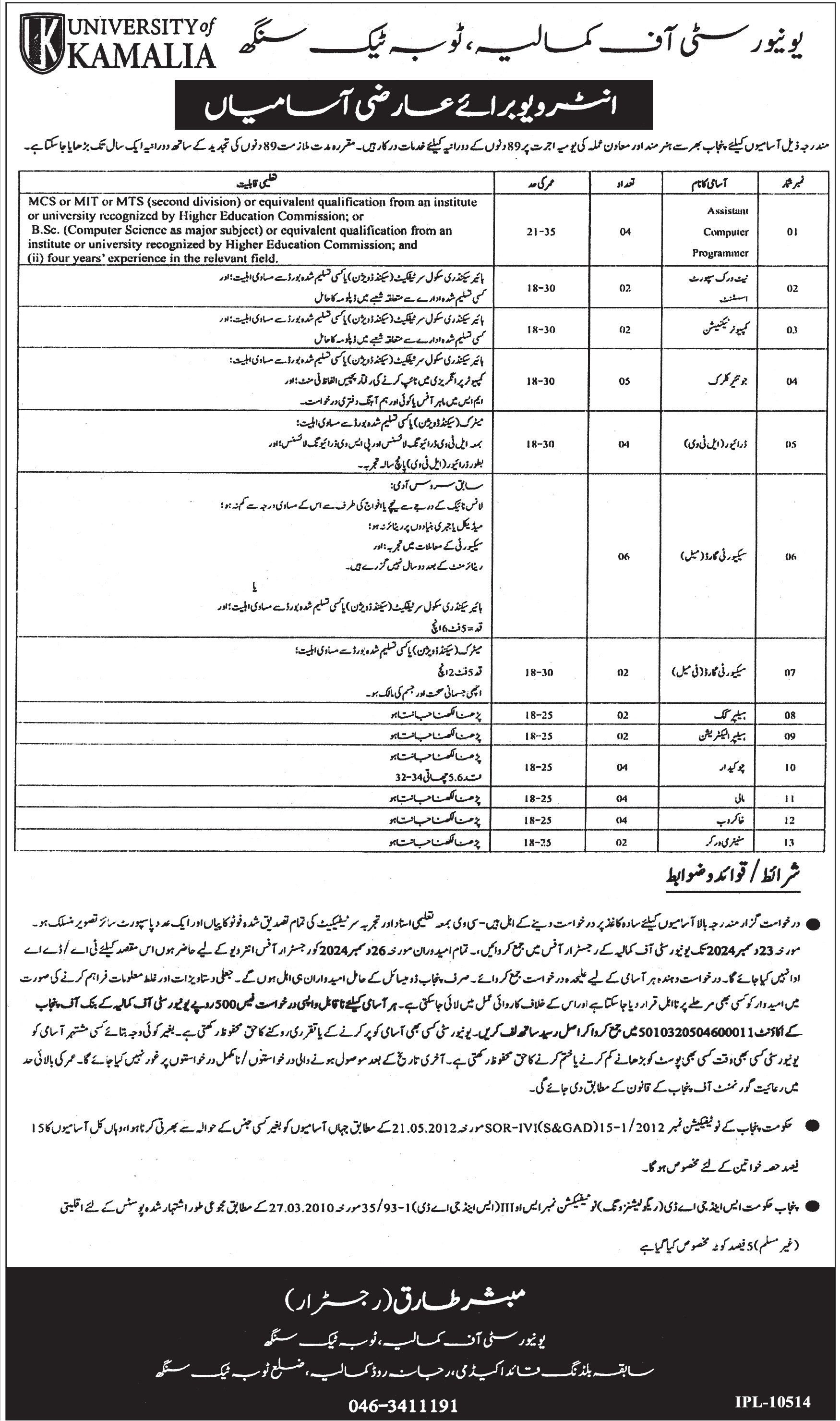 University of Kamalia Kamalia, kamalia Punjab Pakistan invites applications from eligible candidates for the post of khakrob, computer technician, network support assistant, assistant computer programmer, ltv driver, chowkidar, mali, security guard, clerk, helper cook, sanitary worker and helper electrician as per advertisement of December 13, 2024 published in daily Express Tribune Newspaper. Persons with Matric, MCS, MS, MIT, Primary and Intermediate etc. education can apply.