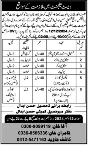 Private Company jobs advertisement dated about 10 December 2024 in daily Ausaf Newspaper invites application for the vacant post of chowkidar, driver, security guard, tehsil assistant manager operations, sanitary supervisor and sanitary worker in Hassan Abdal, hassan abdal and attock Punjab Pakistan. Primary, Intermediate, Middle and Bachelor etc. educational qualification will be preferred.