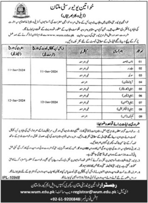 Latest Government walk in interview jobs in Women University Multan in Management and others can be applied till 12 January 2024 or as per closing date in newspaper ad. Read complete ad online to know how to apply on latest Women University Multan job opportunities.