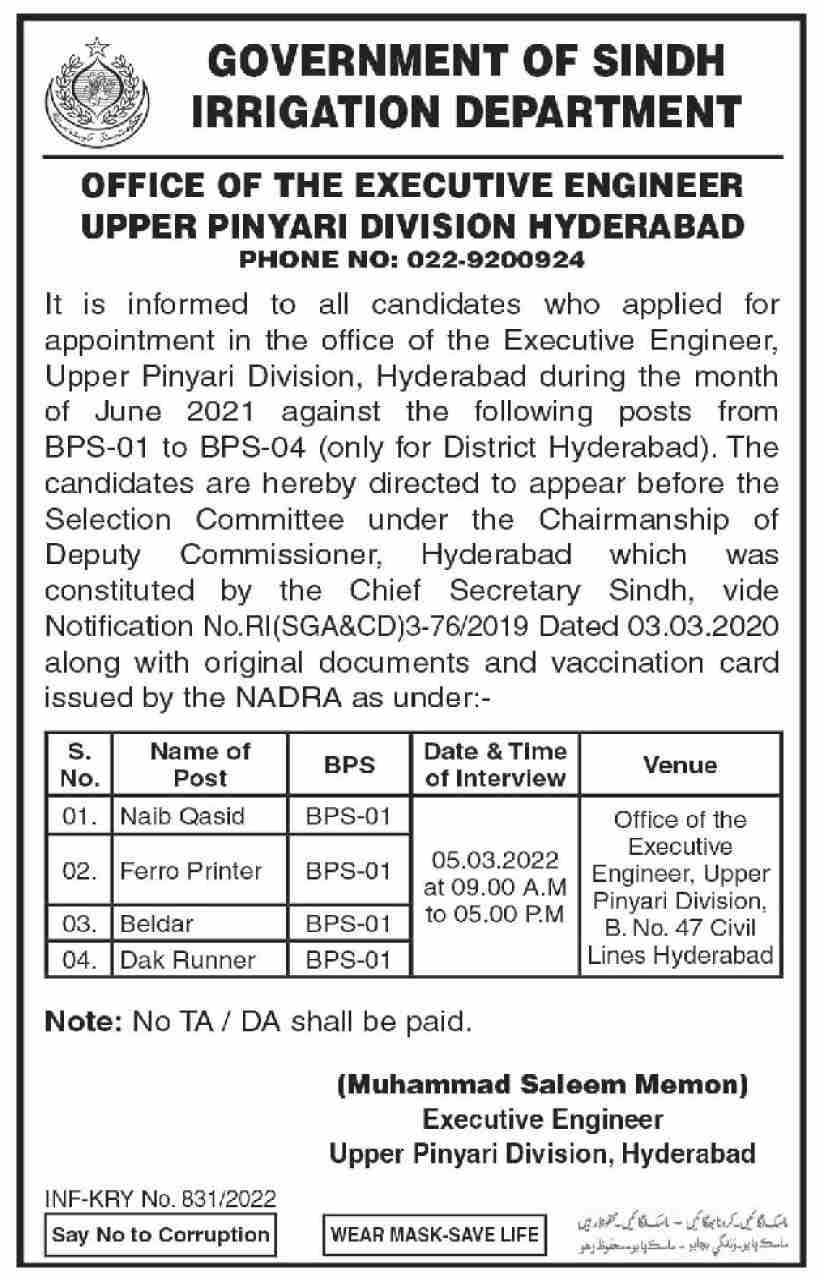 Irrigation Department jobs advertisement dated about 24 February 2022 in daily Dawn Newspaper invites application for the vacant post of beldar, naib qasid, dak runner and ferro printer in Hyderabad, hyderabad Sindh Pakistan. Preferred Education is Middle, Primary and Matric etc.