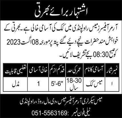 Pakistan Army jobs advertisement dated about 26 July 2023 in daily Express Newspaper invites application for the vacant post of mess cook in Rawalpindi, rawalpindi Punjab Pakistan. Candidates with Middle etc. educational background will be preferred.