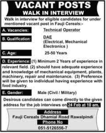 Interviews For Technical Operator Job At Fauji Cereals