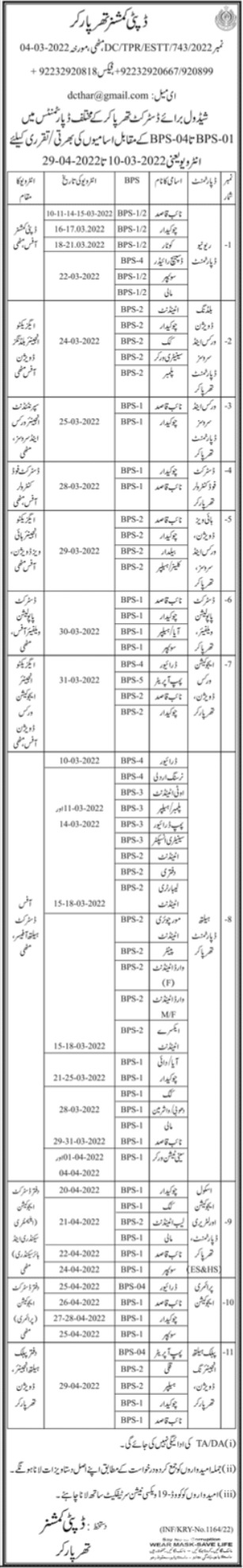 Deputy Commissioner District Office jobs advertisement dated about 10 March 2022 in daily Jang Newspaper invites application for the vacant post of beldar, kotar, cook, aya, dispatch rider, cleaner, washerman, sanitary worker, naib qasid, pump driver, dai, xray attendant, chowkidar, sweeper, attendant, daftari, sanitary inspector, driver, dhobi, laboratory attendant, ot attendant, ward attendant, coolie, mortuary attendant, malhi, sanitation worker, plumber, painter, pump operator, lab attendant, nursing orderly and helper in Tharparkar, tharparkar Sindh Pakistan. Educational qualifications required Middle, Matric, Others and Primary etc.