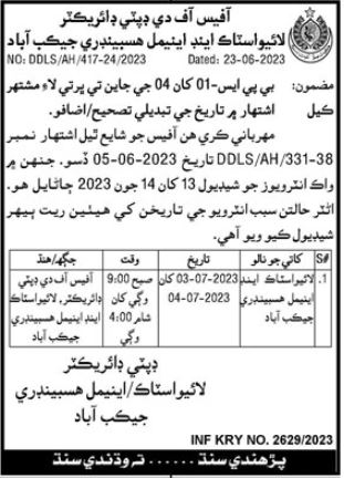 Livestock Department jobs advertisement dated about 25 June 2023 in daily Kawish Newspaper invites application for the vacant post of bps one to bps four in Jacobabad, jacobabad Sindh Pakistan. Middle and Primary etc. educational qualification will be preferred.