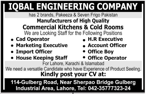 Iqbal Engineering Co is inviting application from experienced candidates for the posts of CAD Operator , Marketing Executive, HR Executive, Accounts Officer, Office Boy, Office Operator, House Keeping Staff, Import Officer in Lahore. Interested candidates can contact on given details for more information