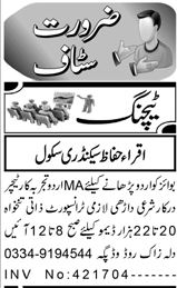 Iqra Huffaz Secondary School is looking for candidates for following posts as per job advertisement published in daily Aaj Newspaper of June 16, 2023 for location Peshawar, peshawar Khyber Pakhtunkhwa KPK Pakistan: