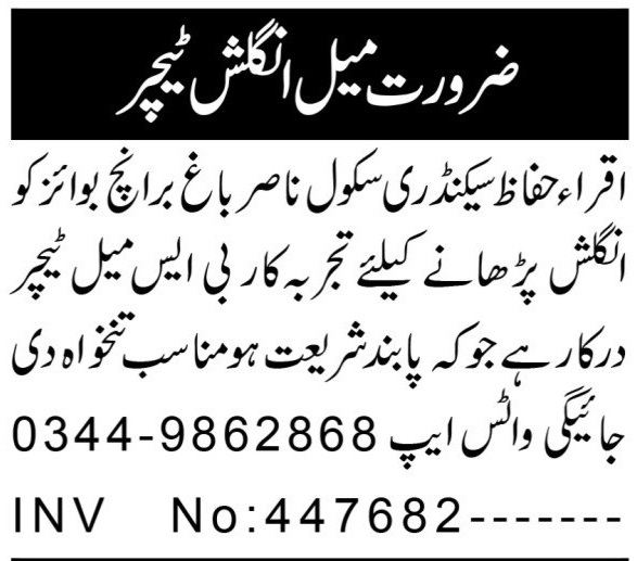 Iqra Huffaz Secondary School invites applications for job positions advertised in daily Aaj dated 5 December 2025 for following vacancies in Nasir Bagh Peshawar, peshawar Khyber Pakhtunkhwa KPK Pakistan.