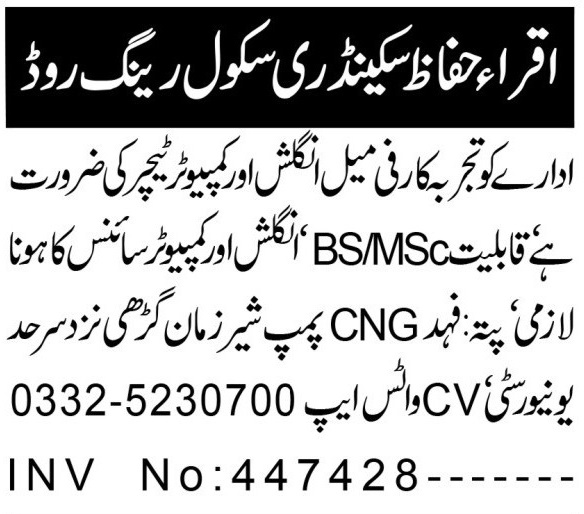Vacant posts including female teacher, english teacher, teacher and computer teacher are announced in Iqra Huffaz Secondary School Ring Road Peshawar, peshawar Khyber Pakhtunkhwa KPK Pakistan as per 28 November 2025 advertisement in daily Aaj Newspaper. Preferred Education is Master and Bachelor etc.