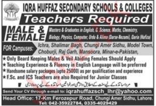 Latest Iqra Huffaz Secondary Schools and Colleges IHSSC Education Posts Lahore 2025