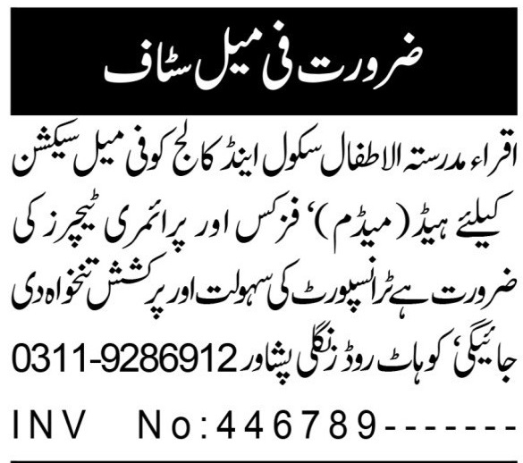 Iqra Madrassa Tul Atfal School & College jobs advertisement dated about 7 November 2025 in daily Aaj Newspaper invites application for the vacant post of teacher, primary teacher, section head, physics teacher and female teacher in Kohat Road Peshawar, peshawar Khyber Pakhtunkhwa KPK Pakistan. Educational qualifications required Bachelor and Master etc.