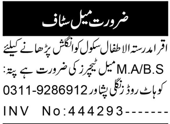 Vacant posts including english teacher and teacher are announced in Iqra Madrassa Tul Atfal School & College Peshawar, peshawar Khyber Pakhtunkhwa KPK Pakistan as per 19 August 2025 advertisement in daily Aaj Newspaper. MA etc. educational qualification will be preferred.