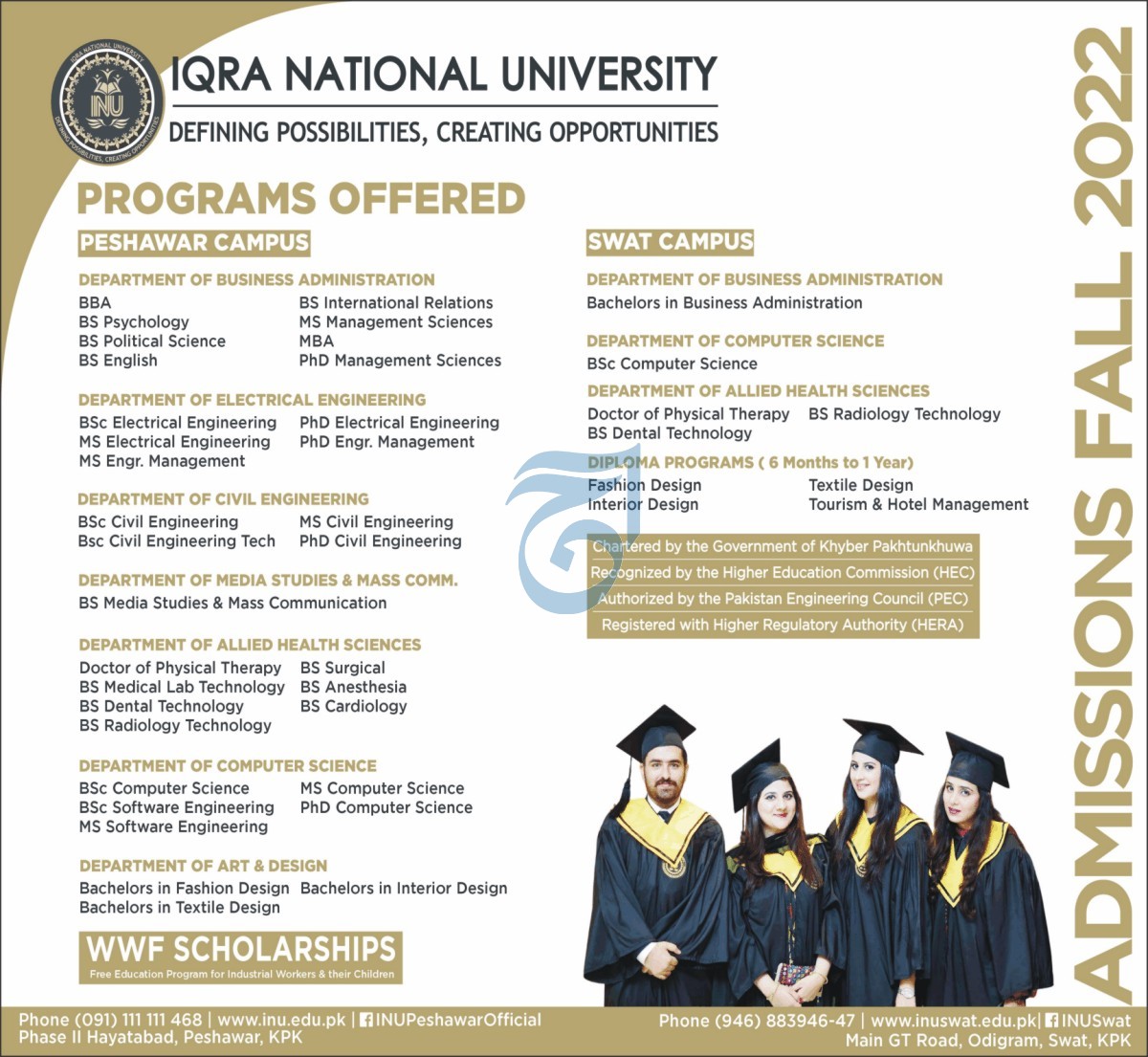 Iqra National University BS, BSc, BBA, BFA, MBA, MS, Mphil, PhD, DPT, BBA admissions 2022 has been started. Eligible students can apply for academic admissions 2022 in Iqra National University Peshawar Khyber Pakhtunkhwa KPK Pakistan for Science University. Eligible students for fulfilling criteria for admissions in Mphil, Diploma, Bachelor, DPT, BS, Phd, Course, BSc Hons, BBA, MBA, BFA, Master and MS can enroll as per Private admission policy 2022 till closing date 18 October 2022. Read newspaper ad for exact details.