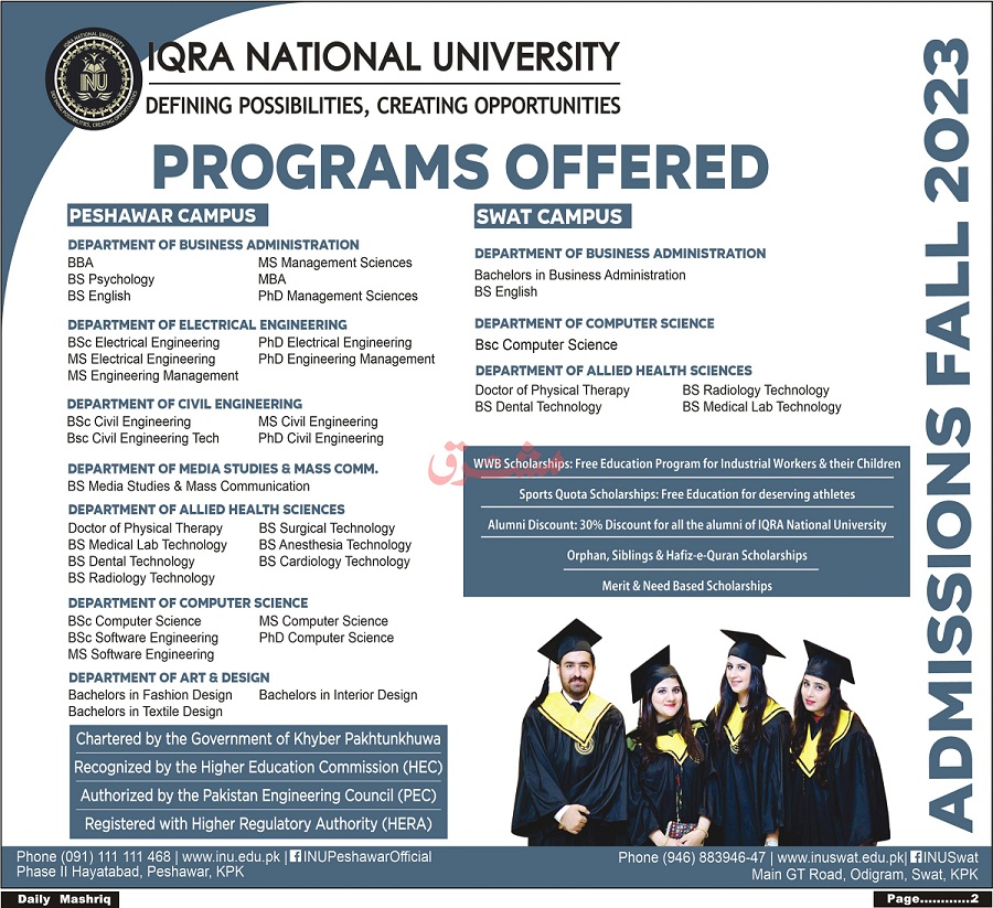 Iqra National University admissions 2023 for BS, BBA, MS, MBA, DPT, PhD has been announced. Students can enroll for admissions in Iqra National University Peshawar Khyber Pakhtunkhwa KPK Pakistan for academic year 2023 to continue campus based or online education in Science University. Students for admissions in Phd, BBA, DPT, MS, BS and MBA & criteria can apply as per Private institute admission policy 2023 before closing date September 13, 2023 as per advertisement. Read newspaper ad for exact details.