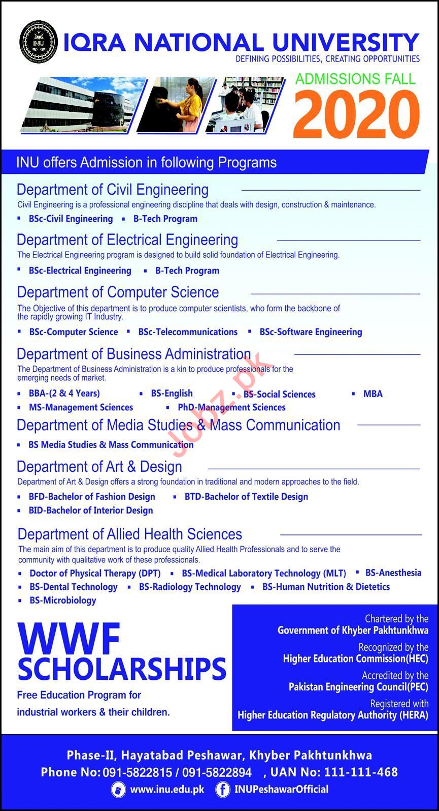 Iqra National University INU Peshawar, Pakistan is opening admissions fall 2020 for the classes of B Sc, BS, B Tech, BBA, MBA, MS, BFD, BTD, BID, DPT, PhD. Read newspaper ad for exact details.