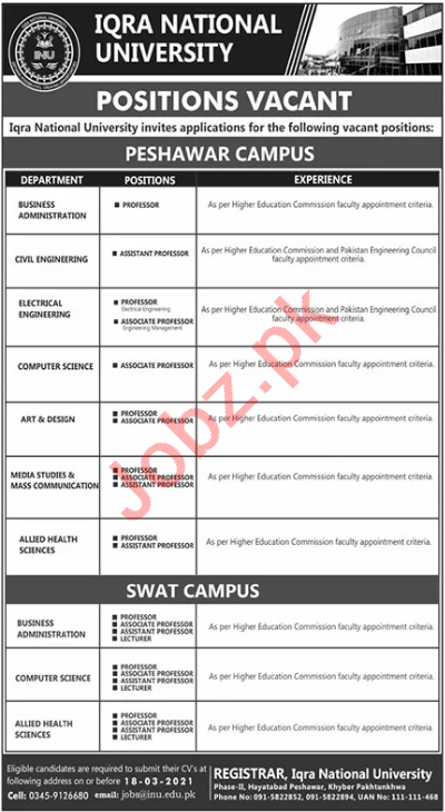 Professor, Assistant Professor, Associate Professor, Lecturer, Professor Business Administration, Professor Civil Engineering, Professor Electrical Engineering, Professor Computer Science, Professor Media Studies, Professor Mass Communication, Professor Allied Health Sciences needs in Iqra National University Peshawar.