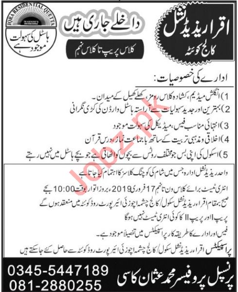 Iqra Residential School and College Quetta, Pakistan are announced admissions spring 2019 for academic sessions 2019 to 2020 for the classes of Class Prep to Class 9th. Read newspaper ad for exact details.