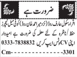 Iqra School & College jobs advertisement dated about 5 April 2022 in daily Jang Newspaper invites application for the vacant post of female teacher, teacher, qari, qaria and quran teacher in Quetta, quetta Balochistan Pakistan. Preferred Education is Master, Bachelor and Intermediate etc.