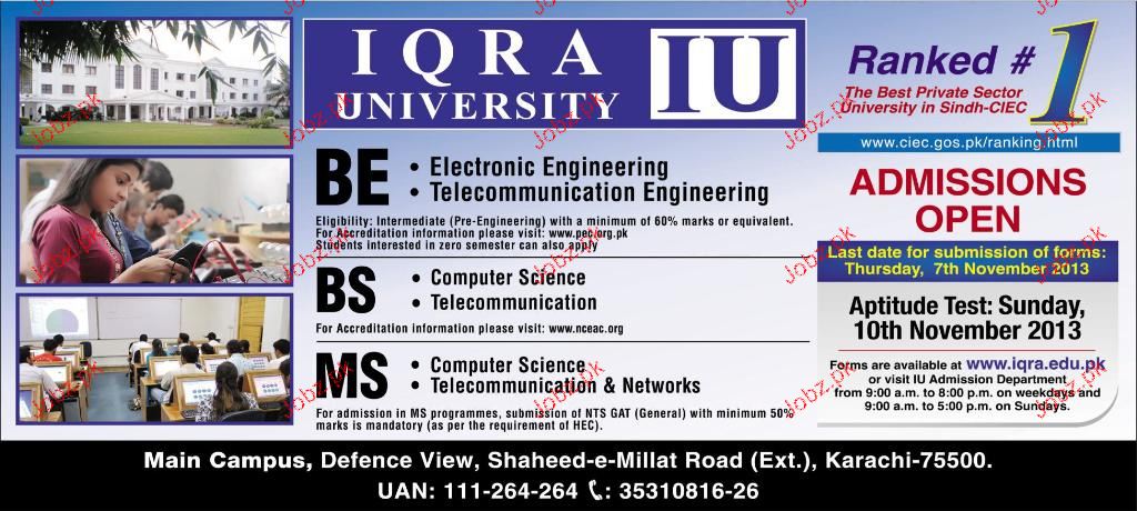 Iqra University Admission in BE, BS and MS in Karachi Read newspaper ad for exact details.