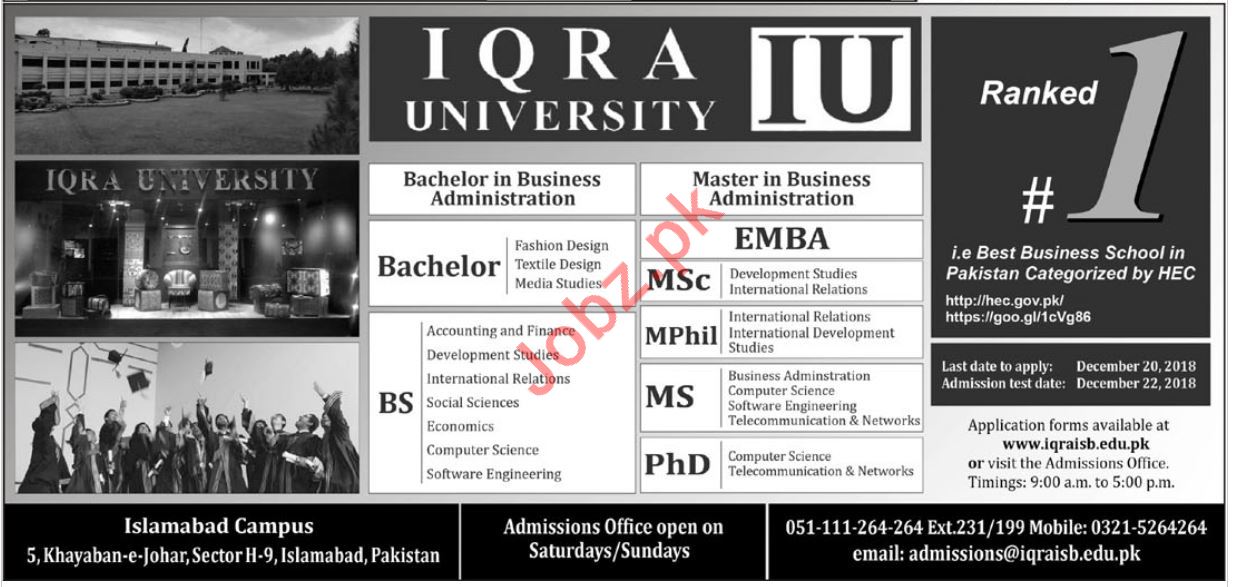 Iqra University Islamabad Campus, Pakistan are announced admissions spring 2019 for the classes of BS (Accounting, Social Sciences), EMBA, MSc, MS, M Phil, PhD. Read newspaper ad for exact details.
