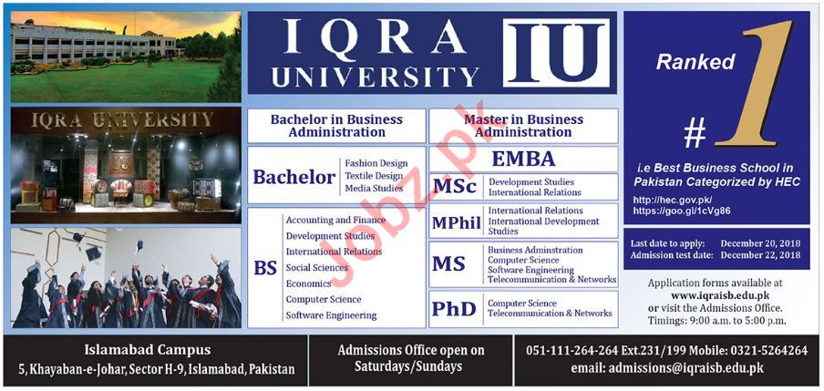 Iqra University Islamabad Campus, Pakistan are announced admissions spring 2019 for the classes of BS, EMBA, M Phil, MS, PhD, Bachelor Fashion & Textile Design. Read newspaper ad for exact details.