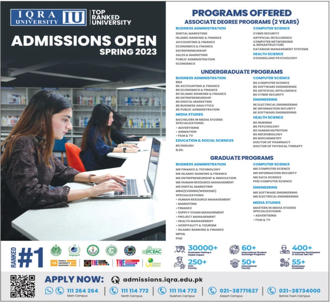 Iqra University Karachi admissions 2022 for Associate Degree Program ADP & Undergraduate Degree Program, Graduate Degree Program has been announced. Students who want to take admissions in Iqra University Karachi Karachi Sindh Pakistan for academic year 2022 to continue education in Science University can apply. Eligible candidates for admissions in ADP, BS, MS, B.ed, Bachelor, Mphil, MBA, B.E, BBA, Phd and Master can apply as per Private institute criteria and before closing date 31 January 2023 after reading advertisement online. Read newspaper ad for exact details.