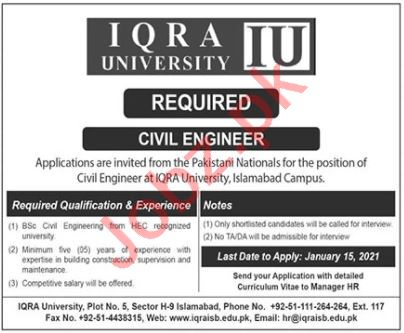 Vacancies in Iqra University Islamabad Advertisement January 2021